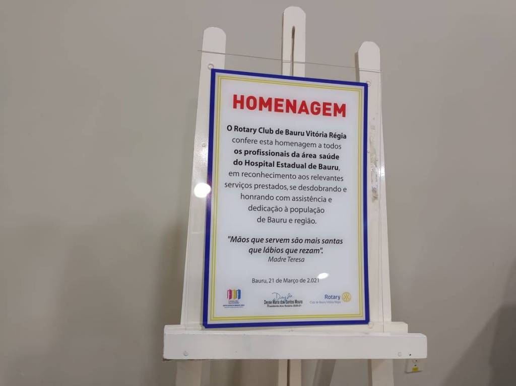No dia 22/03/2021, foi feito o descerramento da Placa em Homenagem ao Hospital Estadual de Bauru, feita pelo Rotary Club de Bauru Vitória Régia, em reconhecimento ao maravilhoso trabalho realizado junto à população nos atendimentos aos casos de Covid-19, sem contudo deixar de prestar a devida assistência às demais especialidades. Estiveram presentes a essa solenidade representando o H.E.B. a Dra Deborah Maciel Cavalcanti Rosa, diretora executiva do Hospital, Patrícia Carolina Ali Ditão e Valdirene Corradini, e representanto do RC Bauru Vitória Régia, Deyse Maria dos Santos Moura, presidente 2020/2021 e Danielli Rôa, coordenadora da Fundação Rotária.