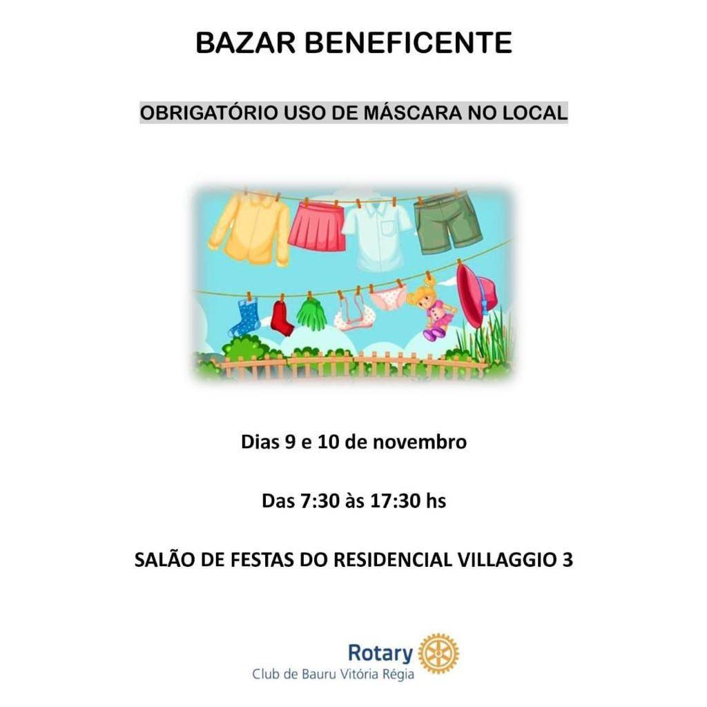 o Bazar Beneficente promovido pelo Rotary Club de Bauru Vitória Régia, acontecerá dias 09 e 10 de Novembro (terça e quarta), no Salão de festas do Residencial Villaggio 3, das 7:30 às 17:30 hs.