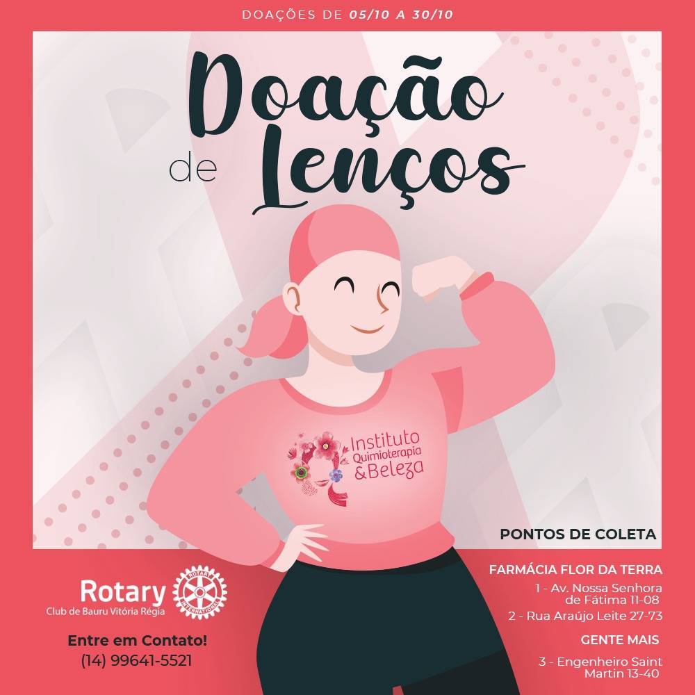 Entendendo a importância desse mês para a saúde da mulher, o Rotary Club de Bauru Vitória Régia, em parceria com o Instituto de Quimioterapia e Beleza, está fazendo uma ação para a Arrecadação de Lenços.