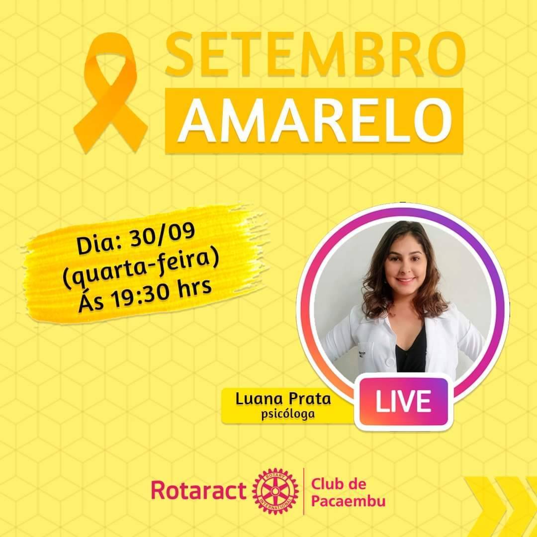 No dia 30 Setembro foi realizada uma live no Instagram do Rotaract Club de Pacaembu sobre o Setembro Amarelo. A live foi coordenada pelo associado Kauê juntamente com a psicóloga Luana Prata, que abordou assuntos relacionados ao movimento Setembro Amarelo, prevenção ao suicídio e sobre a saúde mental diante do isolamento social.