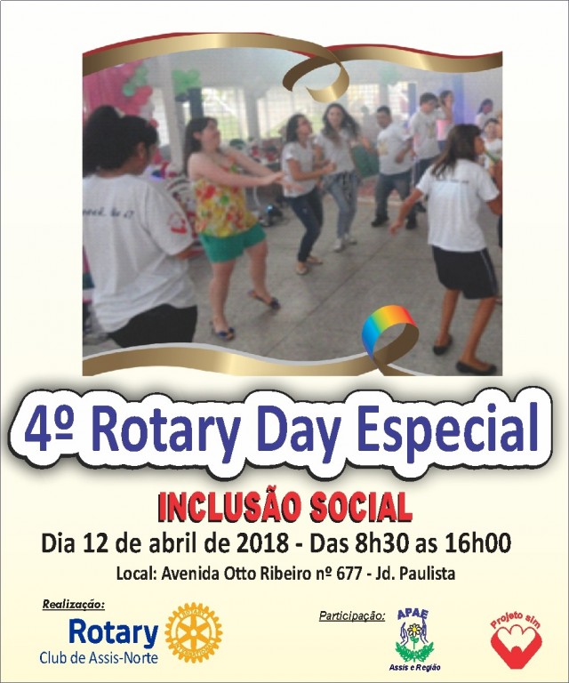 Os Rotary Clubs de Assis Norte em parceria com o RC de Assis Fraternal, compartilham a alegria com as pessoas especiais de Assis e região, onde acontece a 4° Rotary Day Especial na séde da Casa da Amizade, reuniu as APAEs da região, Projetos SIM, SER, Associação dos Cadeirantes. Com muita atração, brincadeiras, musicas e danças, palhaços, e guloseimas, salgados, cachorro quente, pipoca, bolo os jovens alunos das instituições da APAE de Assis e região puderam interagir entre si, uma escolha com a outra, e se conhecerem brincando.