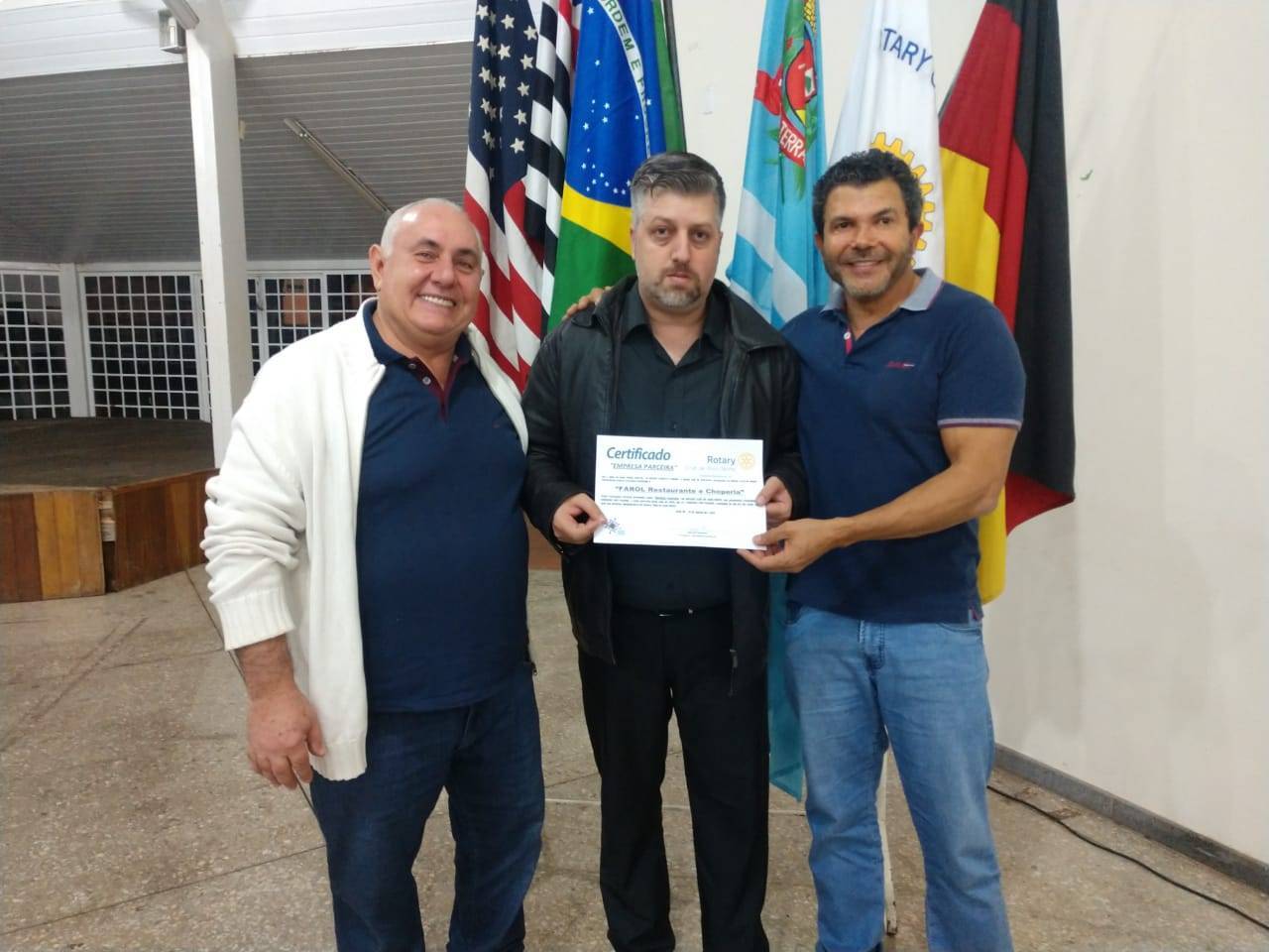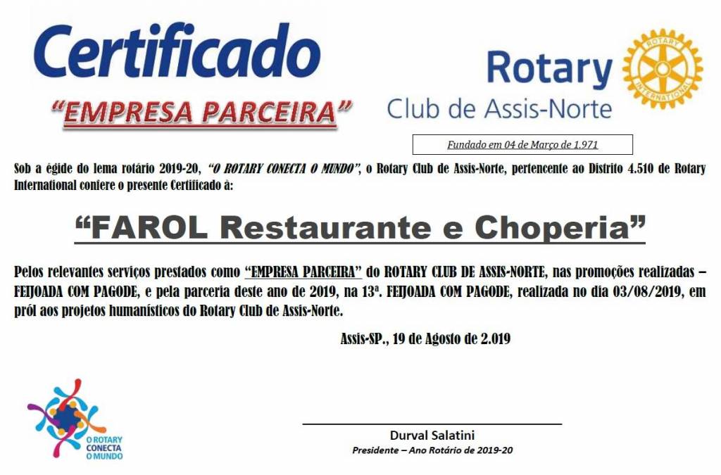 Nesta 2a. Feira, dia 19 de Agosto de 2.019, o presidente do Rotary Club de Assis-Norte,  Cp. Durval Salatini, representando todos os associados do clube, entregou em reunião o CERTIFICADO de EMPRESA PARCEIRA para a empresa FAROL RESTAURANTE E CHOPERIA, representada pelo seu proprietário, Sr. Alex, em agradecimento a parceria realizada na 13a. FEIJOADA COM PAGODE, ocorrida dia 03 de Agosto de 2.019, no Farol Rest. Choperia, em Assis, SP, cuja renda liquida é destinada para os projetos humanisticos do Clube e para a Fundação Rotária.