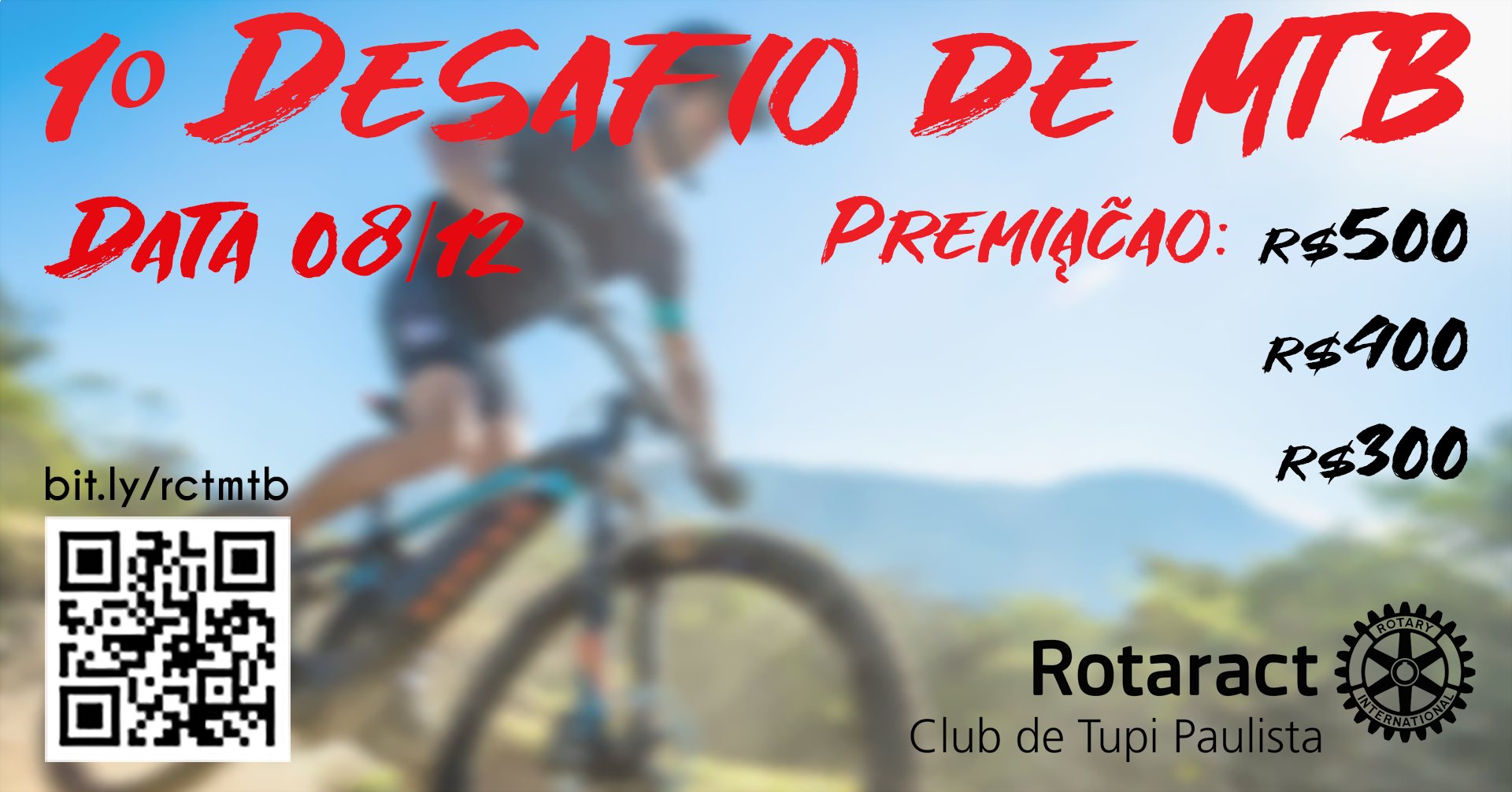 No dia 08 de Dezembro, domingo, será realizado o 1º Desafio de MTB do Rotaract Club de Tupi Paulista. A concentração começa às 06:30 da manhã e o início da prova é às 07:30.