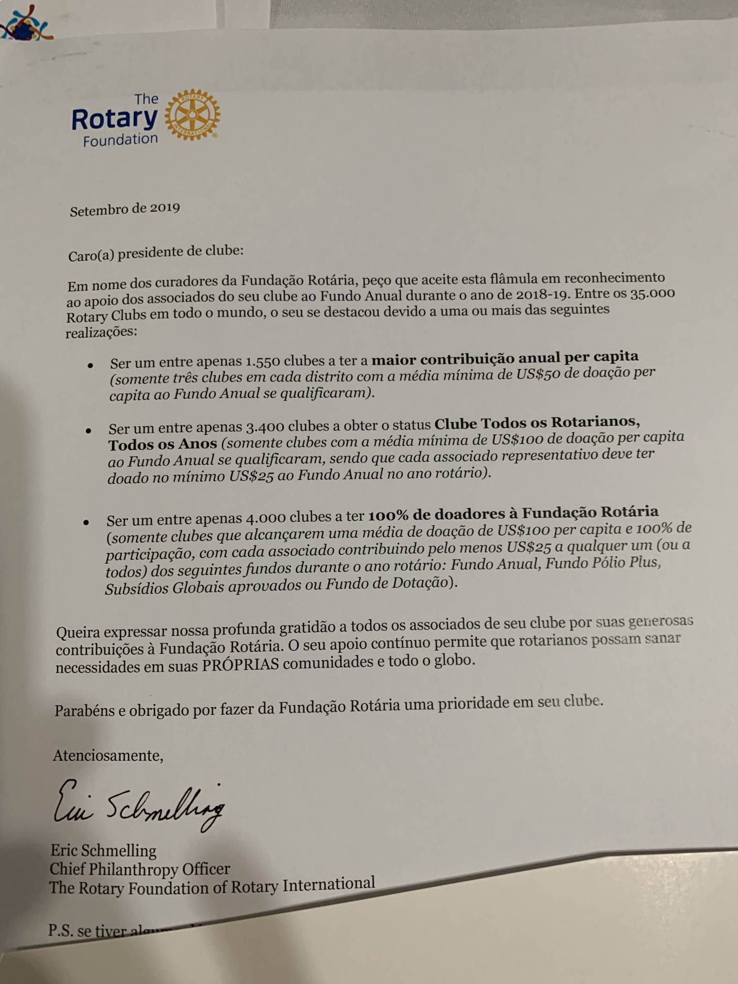 Presidente Neusa Matos levou na reunião do dia 20/10/19 os certificados e flamulas que o RCPP Rosa dos Ventos rwcwbeu da Fundação Rotária na gestão 2018/19.