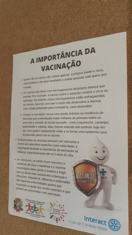 Com base na área de enfoque "Desenvolvimento Econômico e Comunitário" doamos alguns livros para à Biblioteca Municipal de Cândido Mota. Por fim, elaboramos alguns cartazes sobre a importância da vacina infantil e expomos em todos os postos de saúde da cidade.