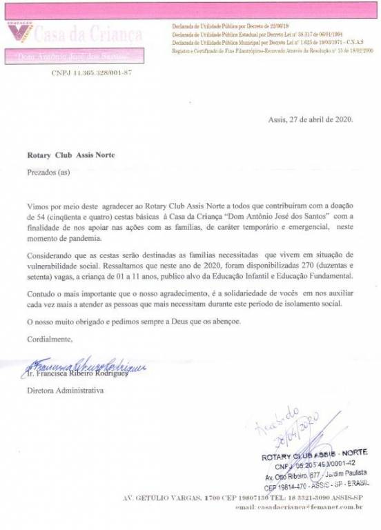 “Agradecemos ao Rotary Club de Assis-Norte e a todos os seus associados que contribuíram com a doação destas 54 cestas básicas à Casa da Criança, com a finalidade de nos apoiar nas ações com as famílias, de caráter temporário e emergencial, neste momento de pandemia. Agradecemos a solidariedade de vocês em nos auxiliar cada vez mais para atender as pessoas que mais necessitam durante este período de isolamento social.” Expressou a Irmã Francisca Ribeiro Rodrigues - Diretora Administrativa da Casa das Crianças Assis.