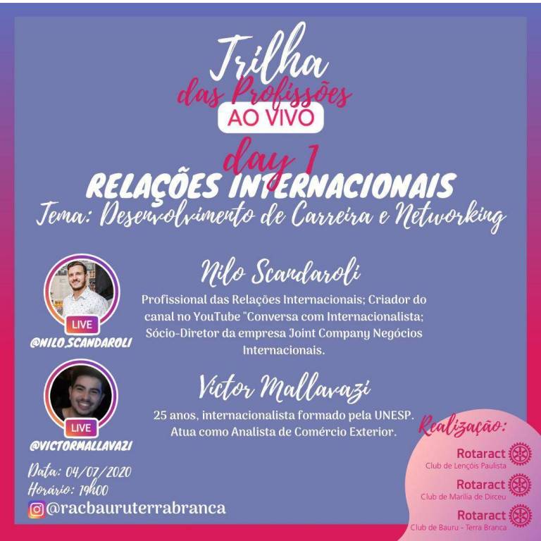 O Rotaract Club Marília de Dirceu em conjunto com o Rotaract Club Bauru Terra Branca e o Rotaract Club Lençois Paulista estão realizando lives com profissionais e rotaractianos de diversas áreas visando demonstrar as características das profissões que exercem.