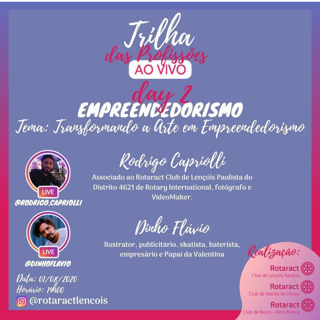 No dia 01/08/2020 os clubes se programam para receber os companheiros Rodrigo Capriolli e Dinho Flávio, que irão falar sobre o tema "Transformando a Erte em Empreendedorismo". A live será transmitida pelo instagram @rotaraclencois. Aguardamos a presença de todos!