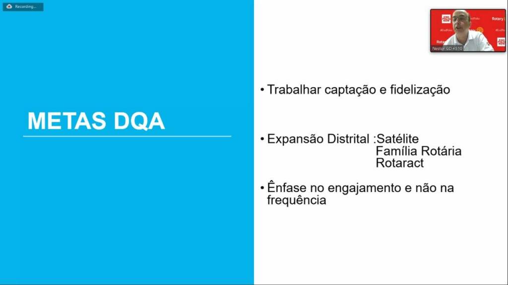 "O Rotary está a cada dia inovando em todos os seus aspectos, em seu desenvolvimento, DQA, passando por esta pandemia da covid-19, em reuniões virtuais, em poder aproximar ainda mais pessoas, pois o presidente de R.I. estimula que temos que aproximar as pessoas, com isto quem está ganhando é todos nós rotarianos, com nossas participações, nosso crescimento de convivencia e de aprendizado". Citou o Gov. D. 4510 2020-21, Nestor S. Amarilho.