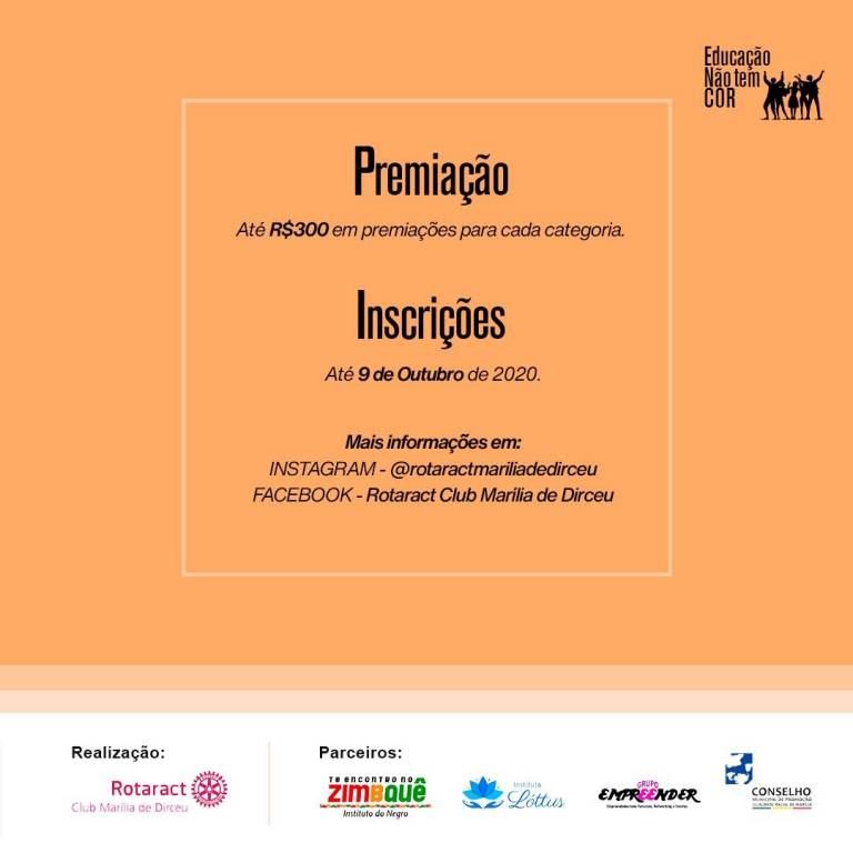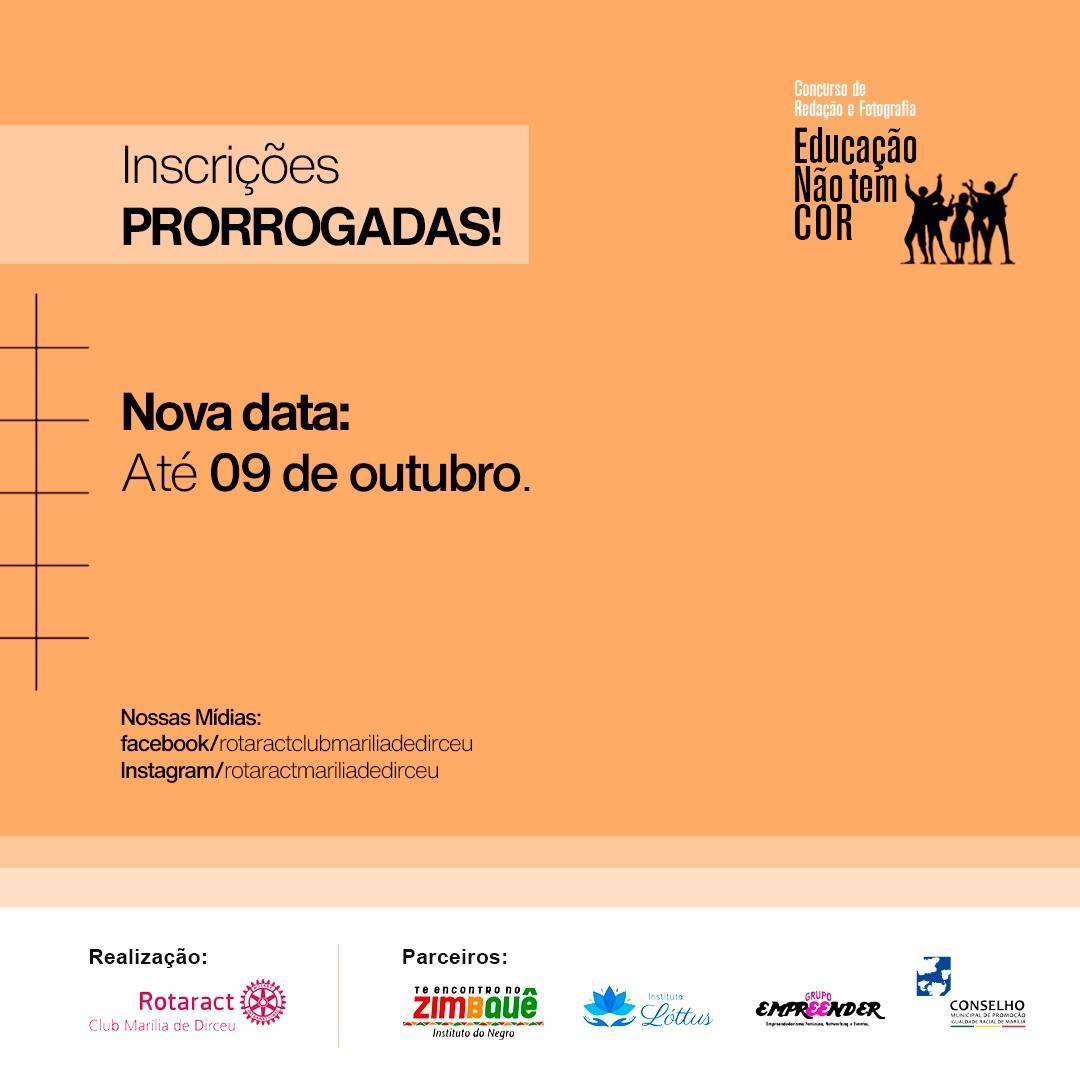 O Concurso de textos e fotografias "Educação Não Tem Cor" que contará com premiações para os melhores textos em combate ao racismo teve seu prazo de inscrições prorrogado para 09/10/2020.
