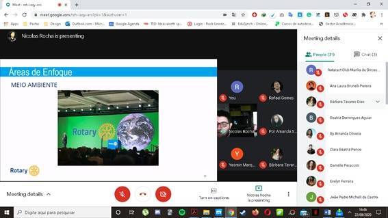 O palestrante Nicolas Pereira, associado ao Rotaract Club de São José dos Campos Sul, apresentou muito bem todas as áreas de enfoque da família rotária, forneceu vários exemplos de projetos realizados e também, conversou sobre a mais recente área: Meio ambiente!