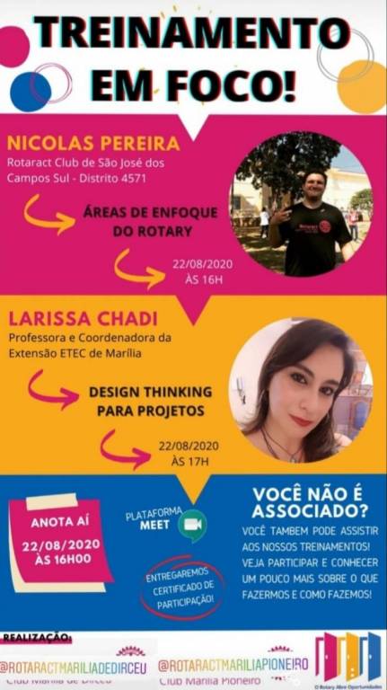 Os rotaract Clubs de Marília-Pioneiro e Marília de Dirceu, se reuniram para promover mais dois treinamento em conjunto no mesmo dia: Áreas de Enfoque do Rotary e posteriormente, Design Thinking para projetos. Foi realizado no dia 22 de agosto, iniciando às 16h00.