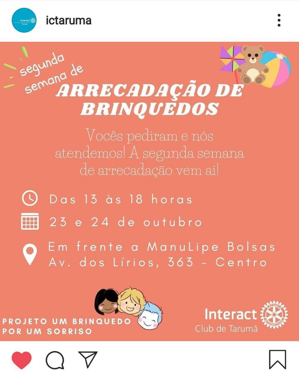 O Interact Club de Tarumã está realizando o Projeto Relâmpago Distrital "Um brinquedo por um sorriso" no mês de outubro, que tem como ideia principal arrecadar brinquedos novos e usados para serem doados à crianças carentes em comemoração do mês das crianças.